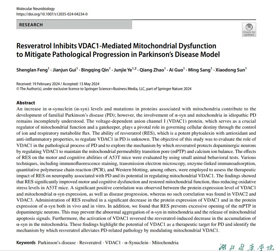 本网讯(通讯员 胡鸿)6月1日,英国上市公司官网365,365英国体育官网下载2020级临床检验诊断学硕士研究生冯胜蓝攻读硕士期间的研究成果在《Molecular Neurobiology》期刊上发表,研究论文题目为《Resveratrol Inhibits VDAC1‑Mediated Mitochondrial DysfunctiontoMitigate Pathological Progression in Parkinson’s Disease Model》,该期刊2024年影响因子5.1,中科院2区。