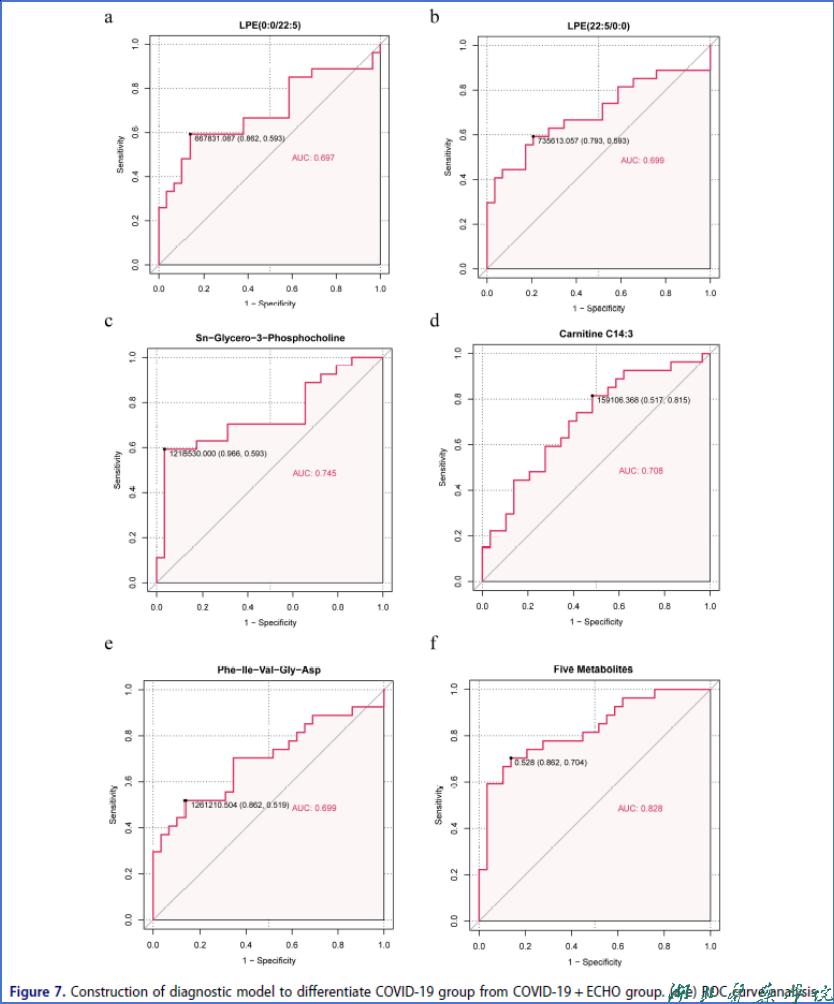 研究结果表明,与单次感染COVID-19的患者相比,双重感染患者表现出更高的炎症和免疫反应。这种差异可能是通过甘油磷脂代谢途径的异常反映出来的,代谢物Sn-Glycero-3-Phosphocholine在这一过程中起着至关重要的作用。最后,该研究利用五种差异代谢物建立了一个基于逻辑回归的诊断模型,该模型能准确区分双重感染人群和单一COVID-19感染人群(AUC = 0.828)。综上,该研究从代谢组的角度揭示了SARS-CoV-2与ECHO合并感染的机制,并从机器学习的角度为合并感染ECHO的COVID-19患者和单一COVID-19患者染的区分提供诊断依据。