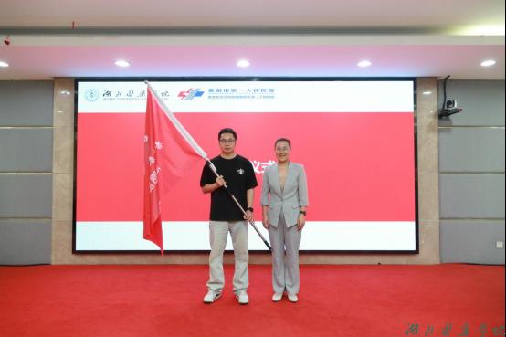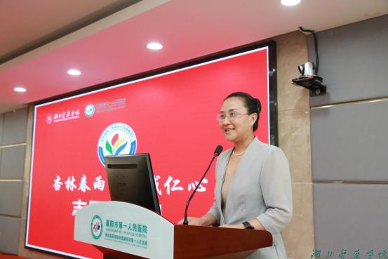 谭艳为志愿服务队授旗并作总结讲话。她对附属襄阳市第一人民医院援藏工作给予充分肯定,代表学校向爱国忠诚、勇于担当、无私奉献的援藏志愿者表达感谢!