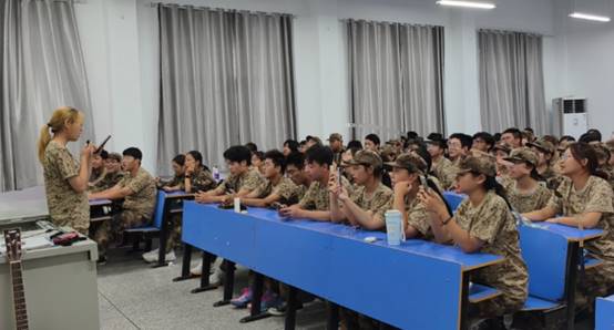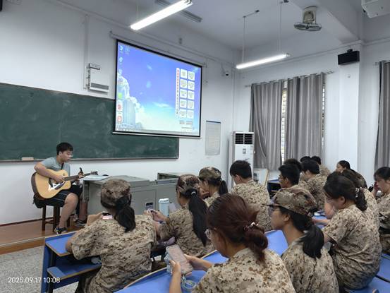 学院23级、24级的学长学姐们为军训新生精心准备了文艺类节目,吉他弹唱引来新生们的集体合唱,也激发了新生们的表演热情,大家踊跃举手,争先上台表演,现场气氛欢乐热烈。