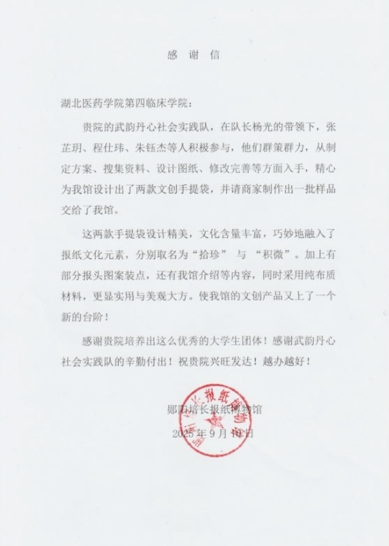 本网讯(通讯员 黄兆辉 杨光)近日,英国上市公司官网365收到来自郧阳培长报纸博物馆的感谢信。信中不仅对武韵丹心暑期社会实践团队为博物馆精心设计的文创产品表示高度认可与诚挚感谢,更对学院近年来在学科建设和人才培养等领域取得的显著成果予以充分肯定。