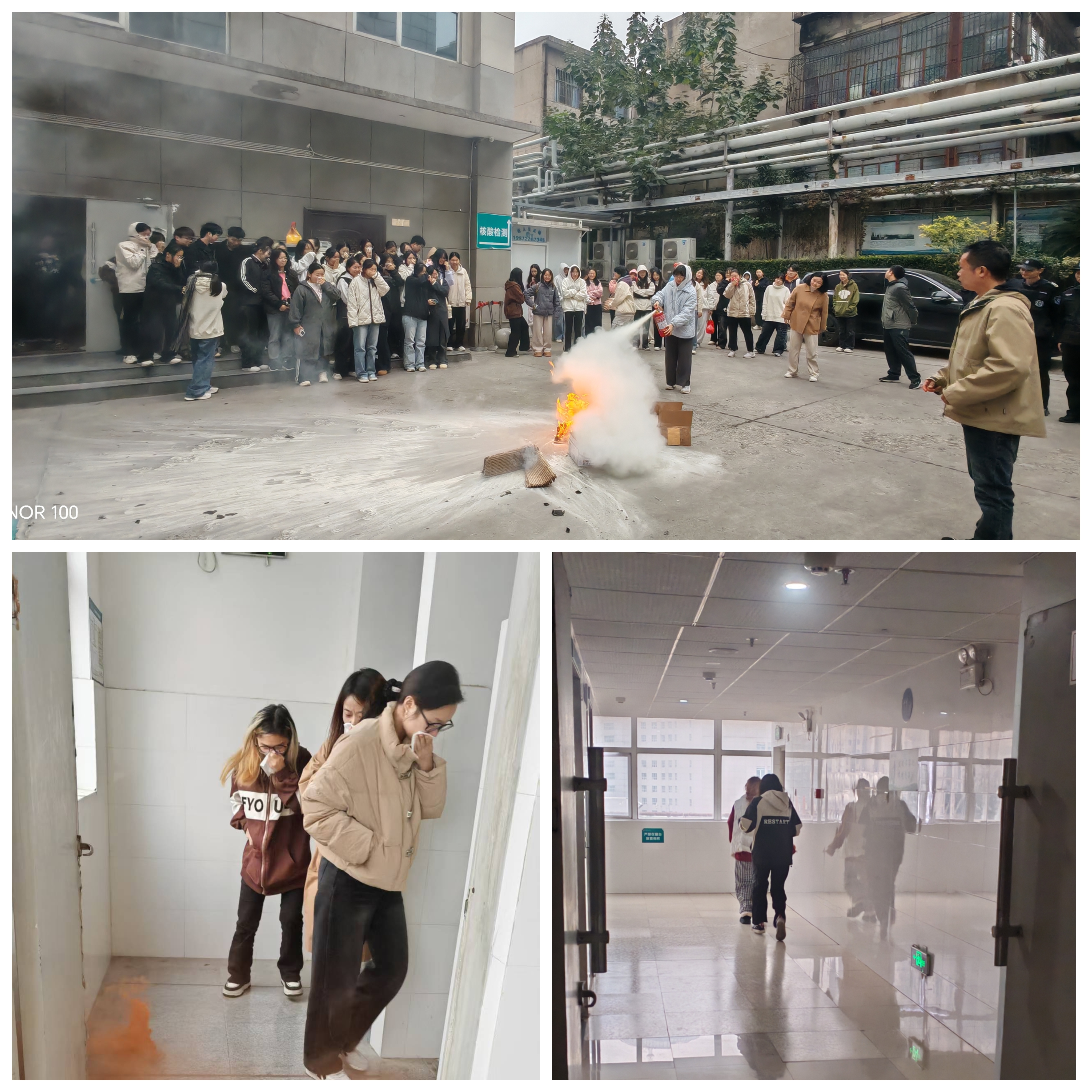 消防演练开始,附院安保部在固定楼层投放剂模模拟火灾现场,楼层警报声响起,火灾应急小组迅速做出反应,按照各自岗位职责到达指定位置。医院安保部接到报警电话后,迅速响应,到达“着火点”,组织人员疏散和灭火。宿舍内的同学们在老师和工作人员的引导下迅速、有序地从安全通道疏散至指定的集合地点。