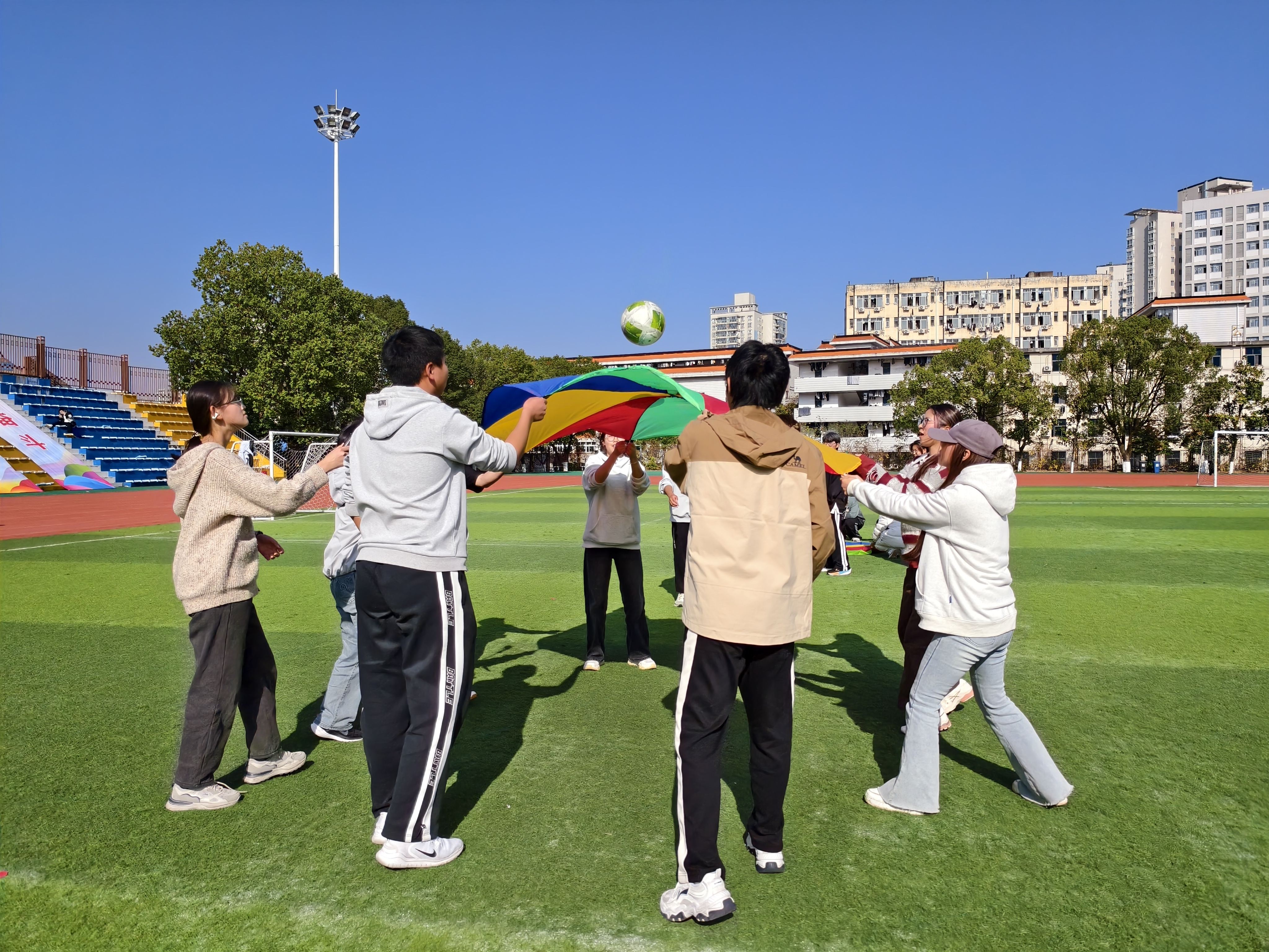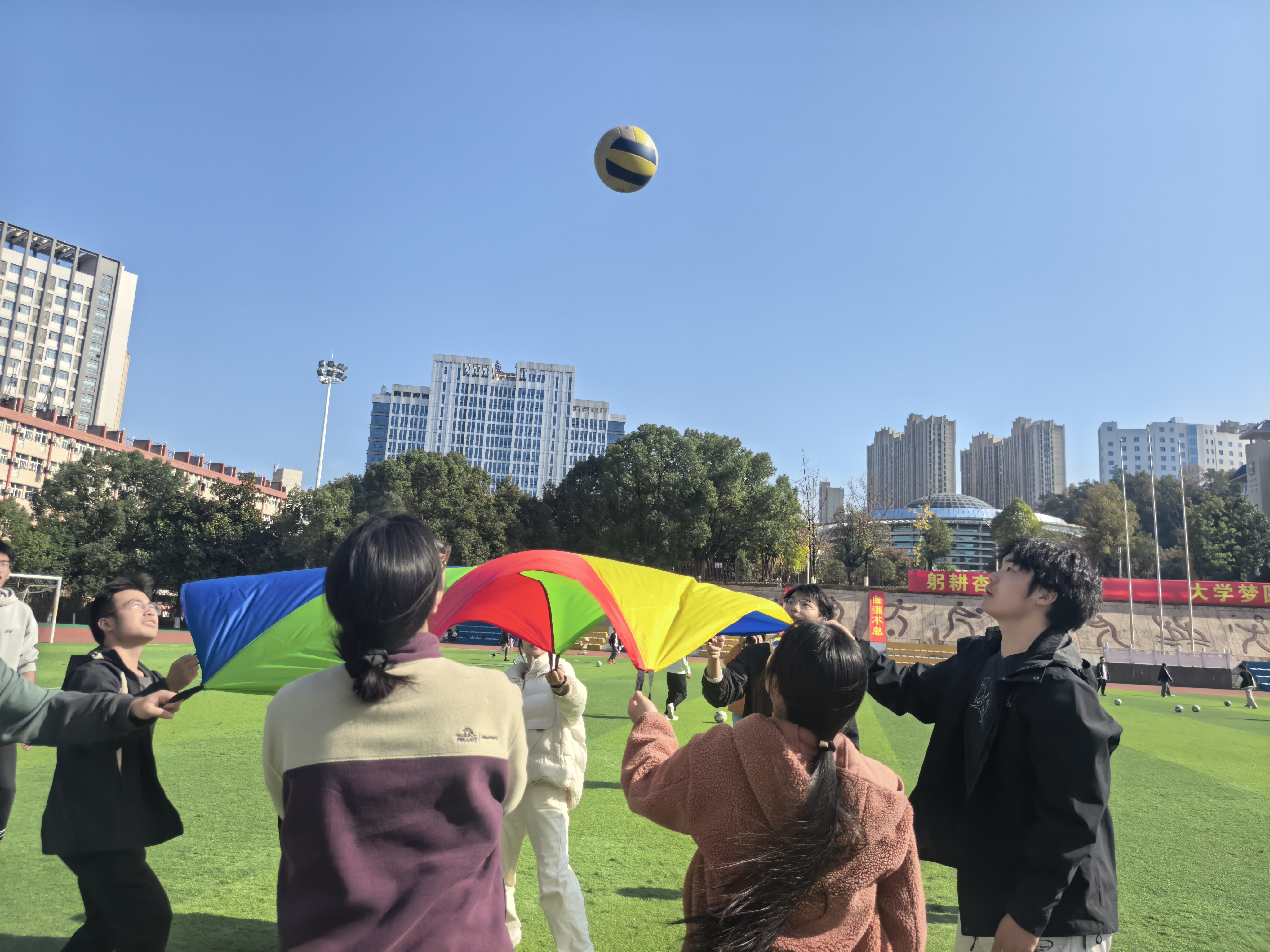 “彩虹颠球挑战”压轴登场,考验团队协作的终极时刻来了。队员们牵着彩虹布的一角,依靠共同的力道与节奏让皮球在彩虹布上平稳起落。辅导员龙姐也加入了阵营,彩布起伏,球影跃动,团队协作达到最佳状态,也将整个活动的热烈氛围推向了最高潮。