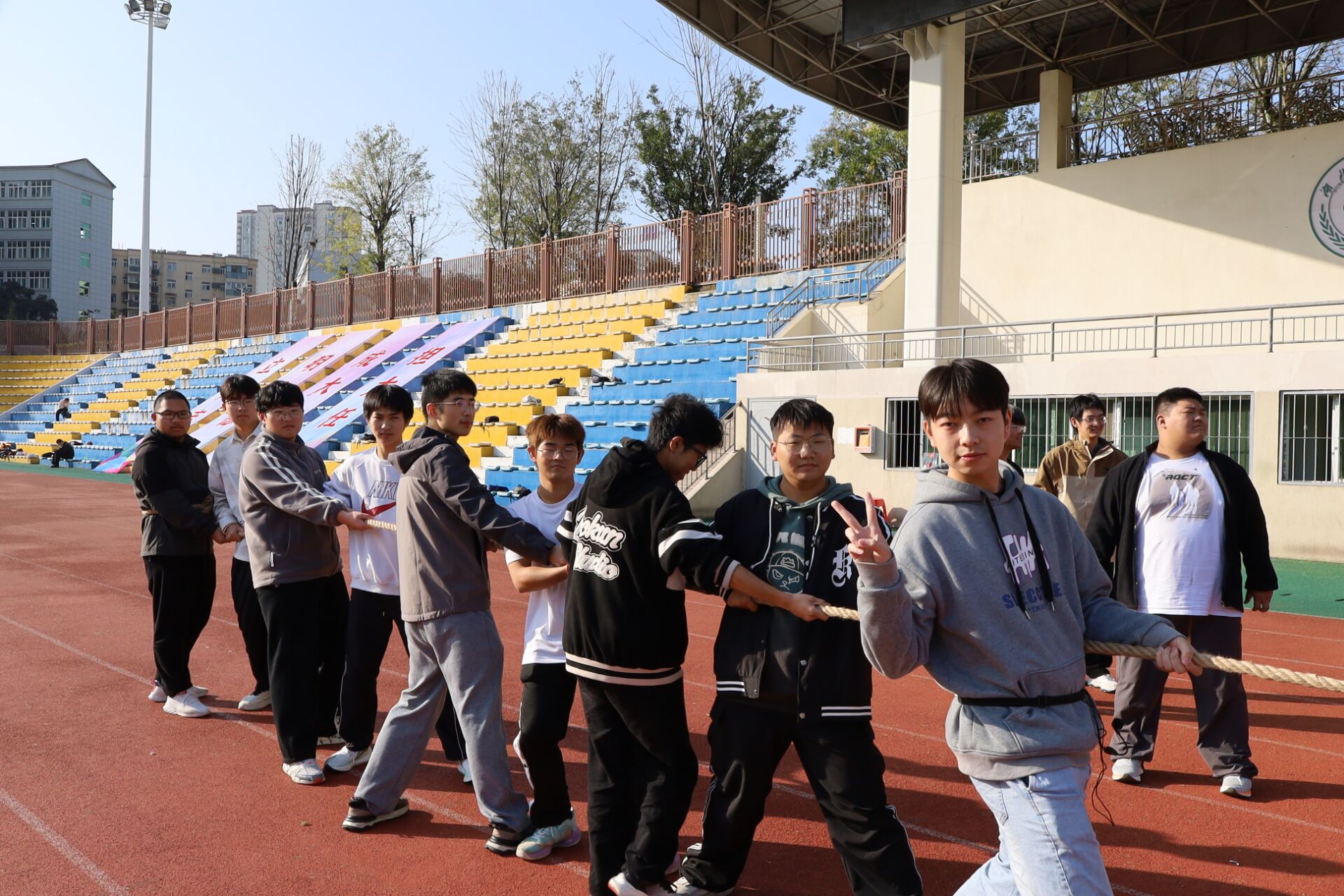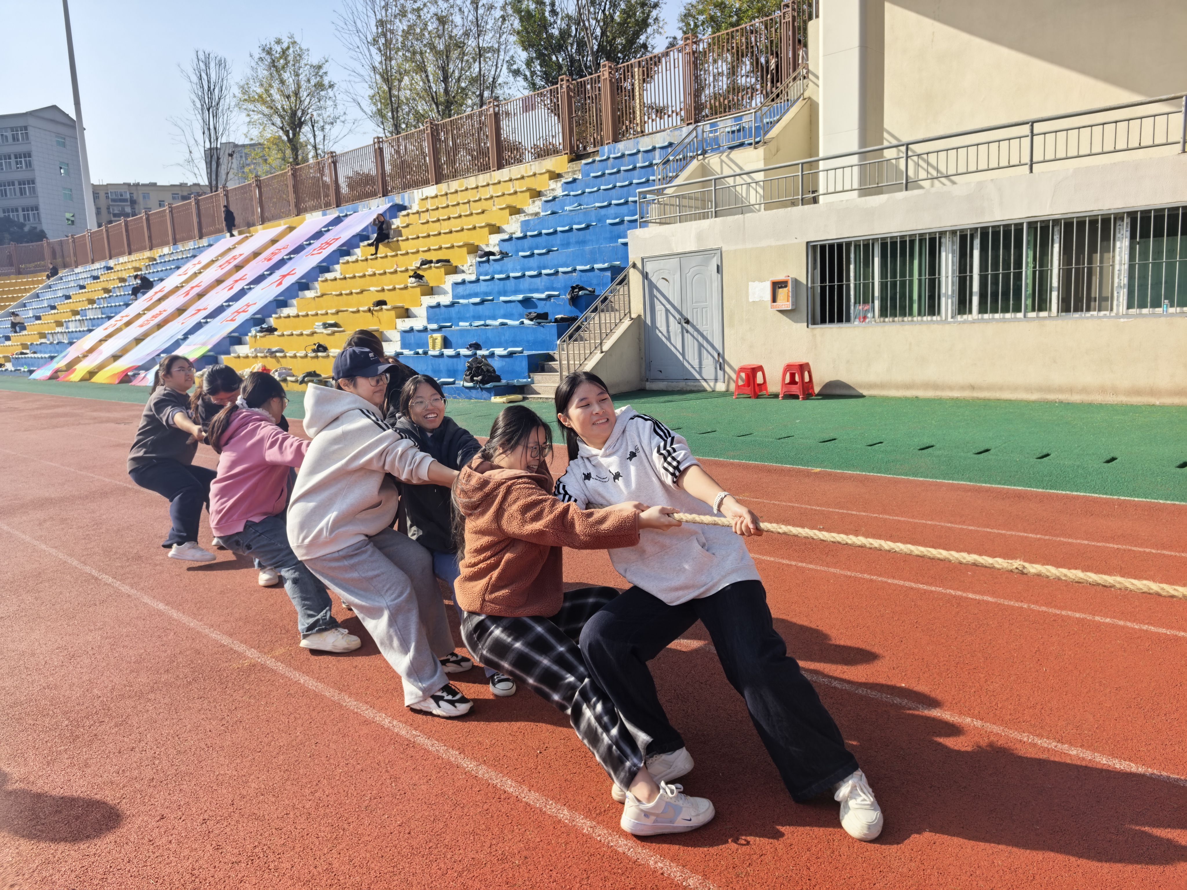 拔河比赛趁热进行,各队队员迅速进入状态,围拢商议站位策略,反复练习发力姿势。