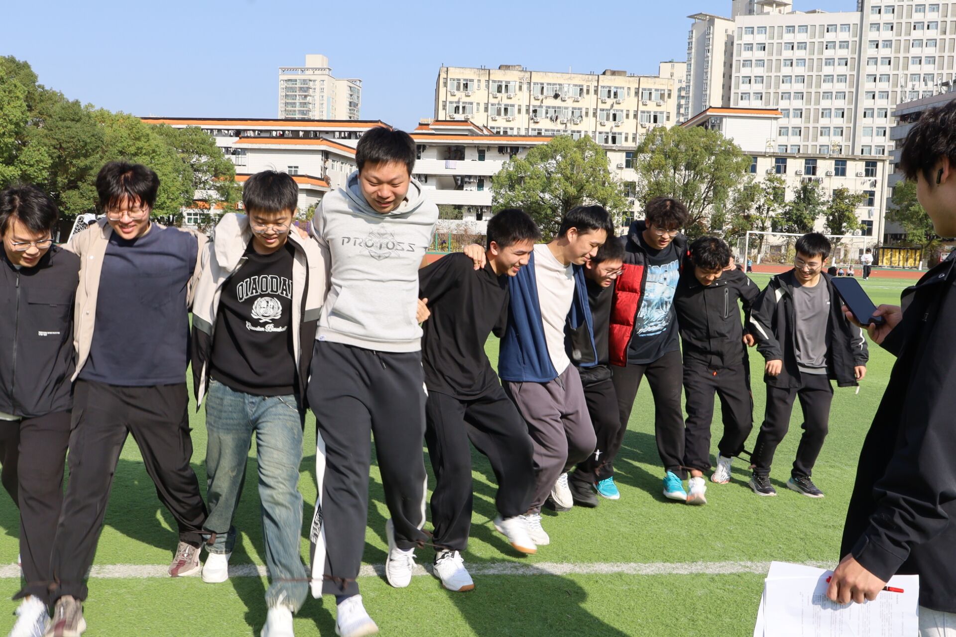 力拔山河的激情尚未平息,另一项关乎节奏与默契的挑战——“绳”采飞扬·团体跳大绳悄然接棒。因为部分同学不擅长跳大绳,这个项目意外成了少数人的高光专场。许人卓表现尤为亮眼,他看准绳间空隙便游鱼般切入,即便节奏突然加快也从容应对,每一次起落都精准合拍,赢得场边阵阵喝彩。