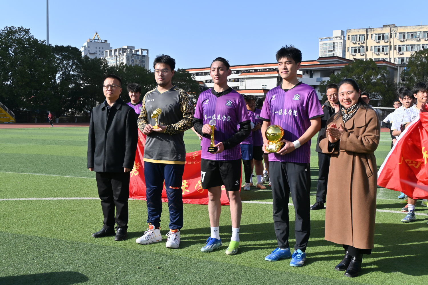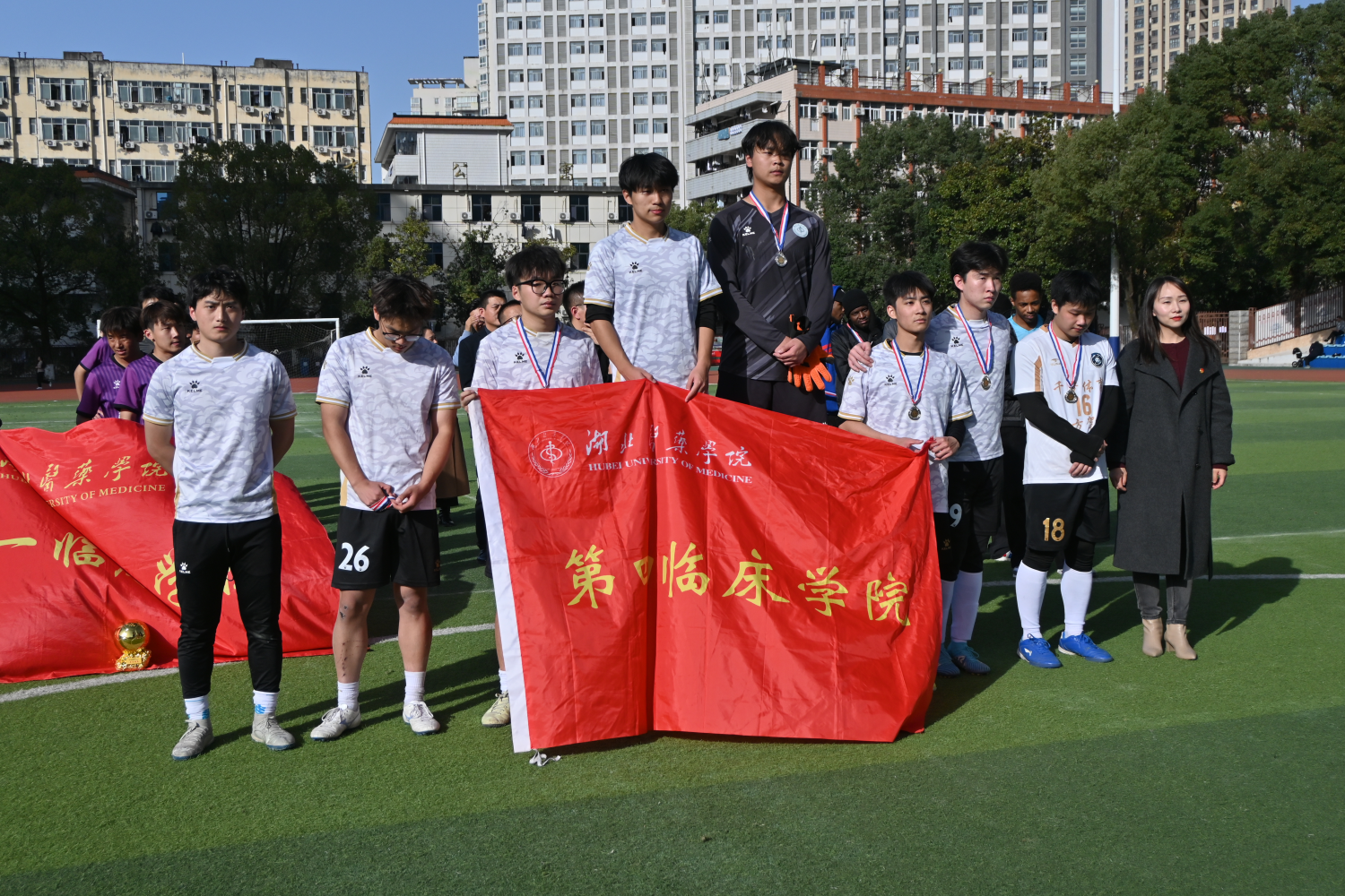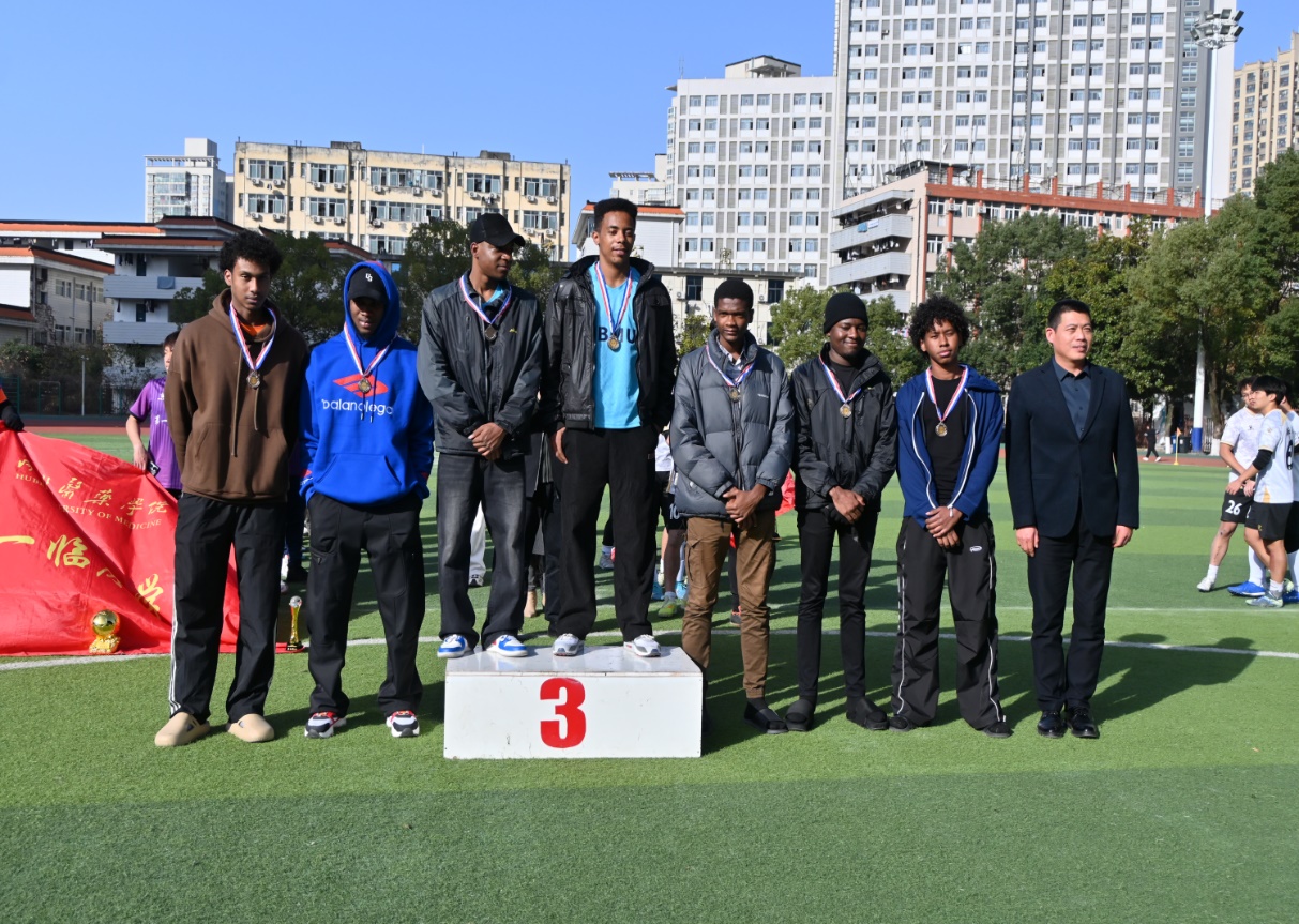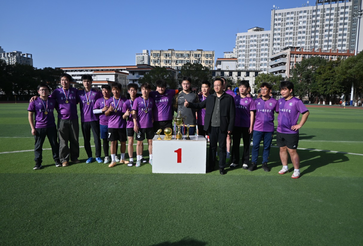 作为赛事收官焦点,决赛在第四、五学院联队与第一临床学院代表队之间展开巅峰对决。双方队员秉持对足球的热忱与夺冠信念,在绿茵场上奋勇拼搏、攻防交锋,展现了精湛的球技与昂扬的斗志。本次决赛创新采用校园融媒体直播形式,学校官方抖音号、微信视频号全程同步转播,并特邀人文学院朱钊老师、图书馆吕飞老师担任解说嘉宾。两位解说不仅专业剖析赛事进程,更串联起学校深厚的体育文化底蕴与足球运动传统,生动传递赛场紧张氛围与精彩瞬间,引得现场欢呼声、呐喊声此起彼伏,响彻绿茵场。终场哨响,第一临床学院代表队凭借出色发挥斩获冠军,第四、五学院联队荣获亚军;此前落幕的三四名争夺战中,国际教育学院代表队胜出摘得季军。